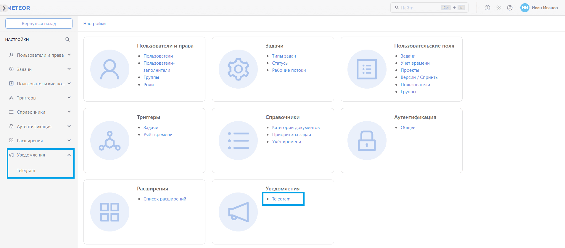 В разделе Уведомления выберите пункт "Telegram":