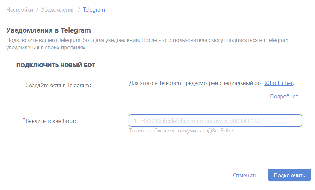 После регистрации BotFather выдаст ссылку на бот и токен для доступа. Полученный токен вставьте в соответствующее поле и нажмите кнопку "Подключить".