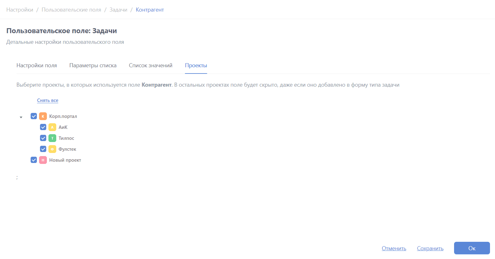 - Поле активировано для проекта. Подробнее в статье "Настройки проекта".