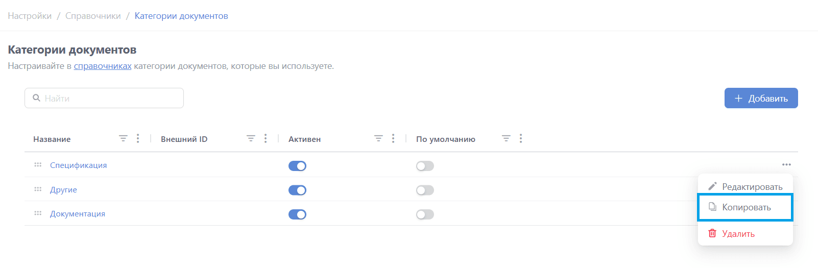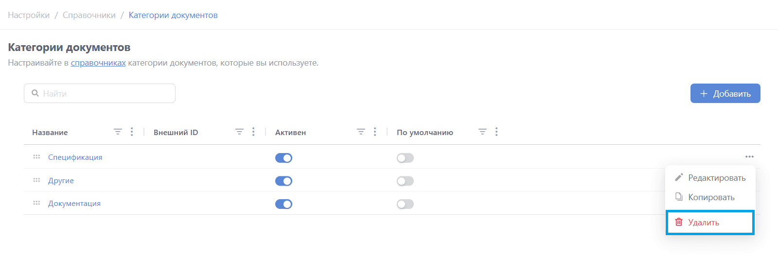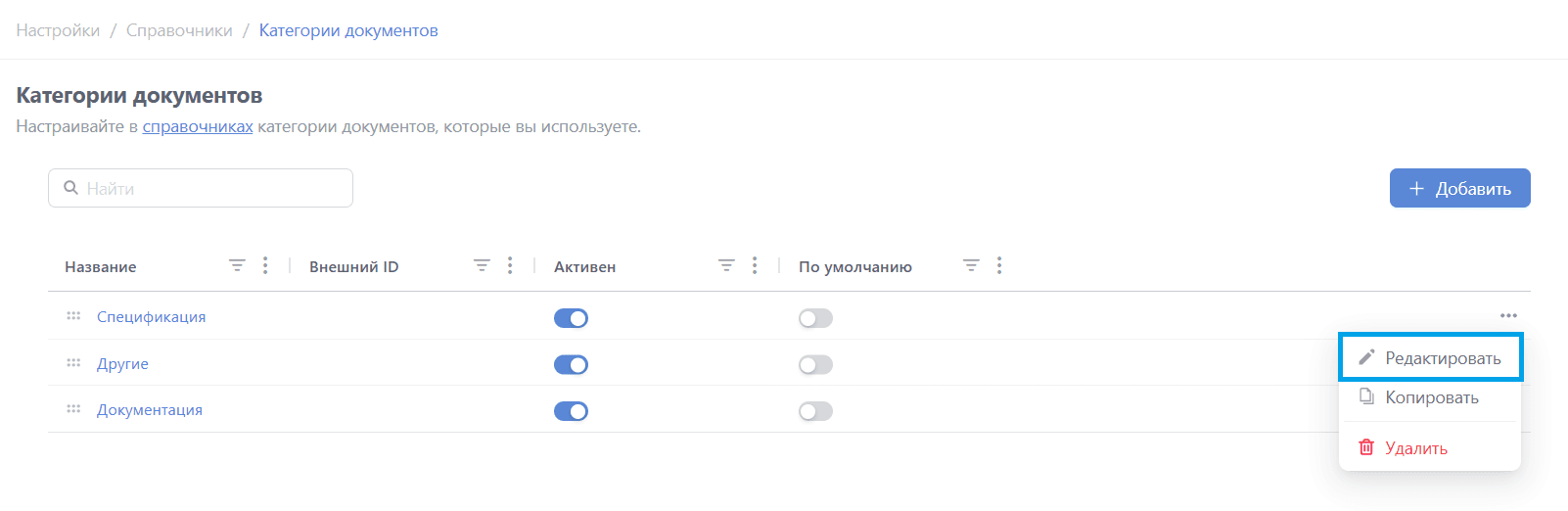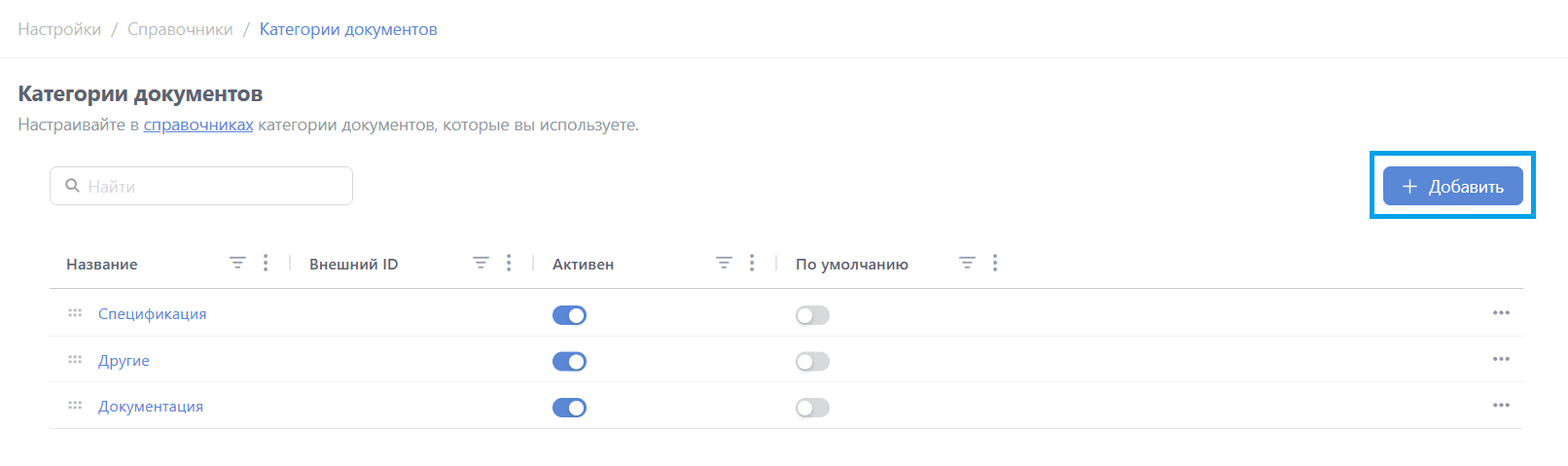 Для добавления категории нажмите кнопку "+ Добавить":