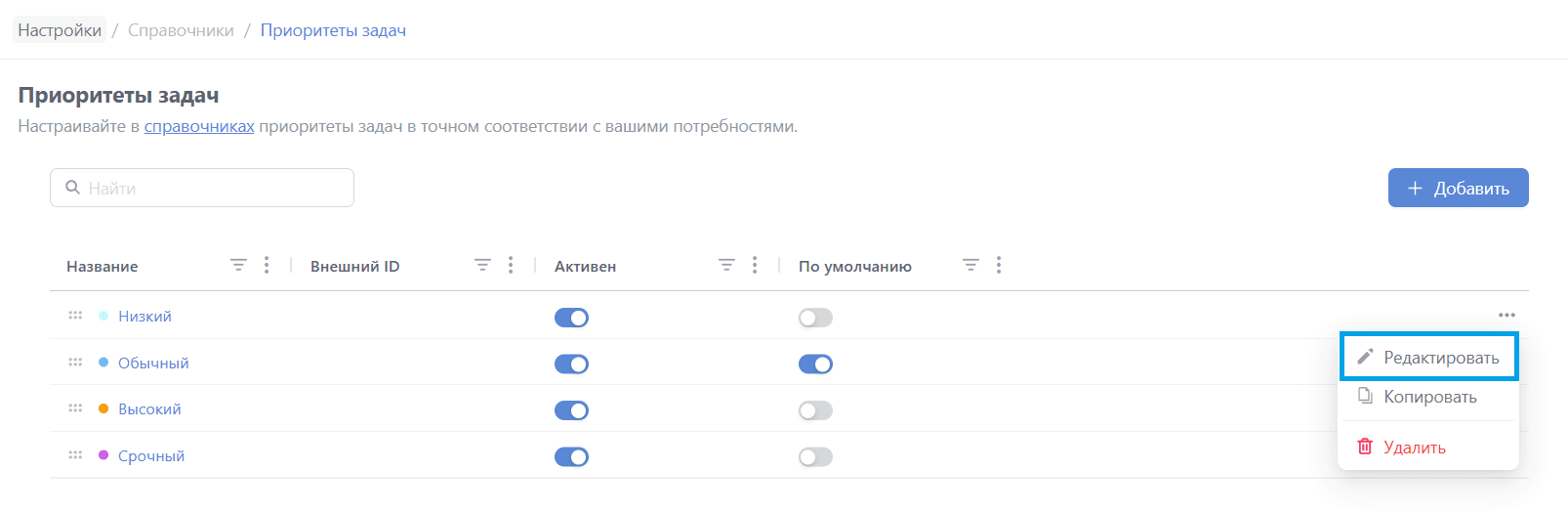 Откройте необходимый приоритет кликом по названию или через кнопку "Редактировать" в контекстном меню: