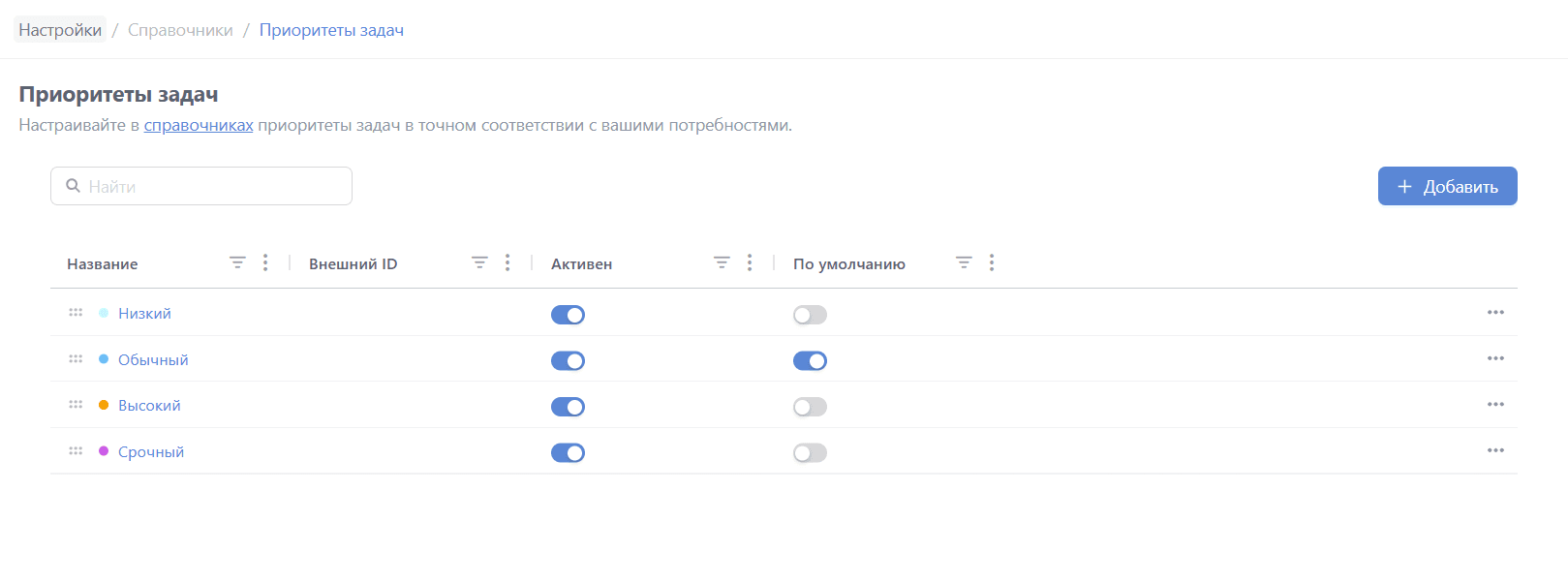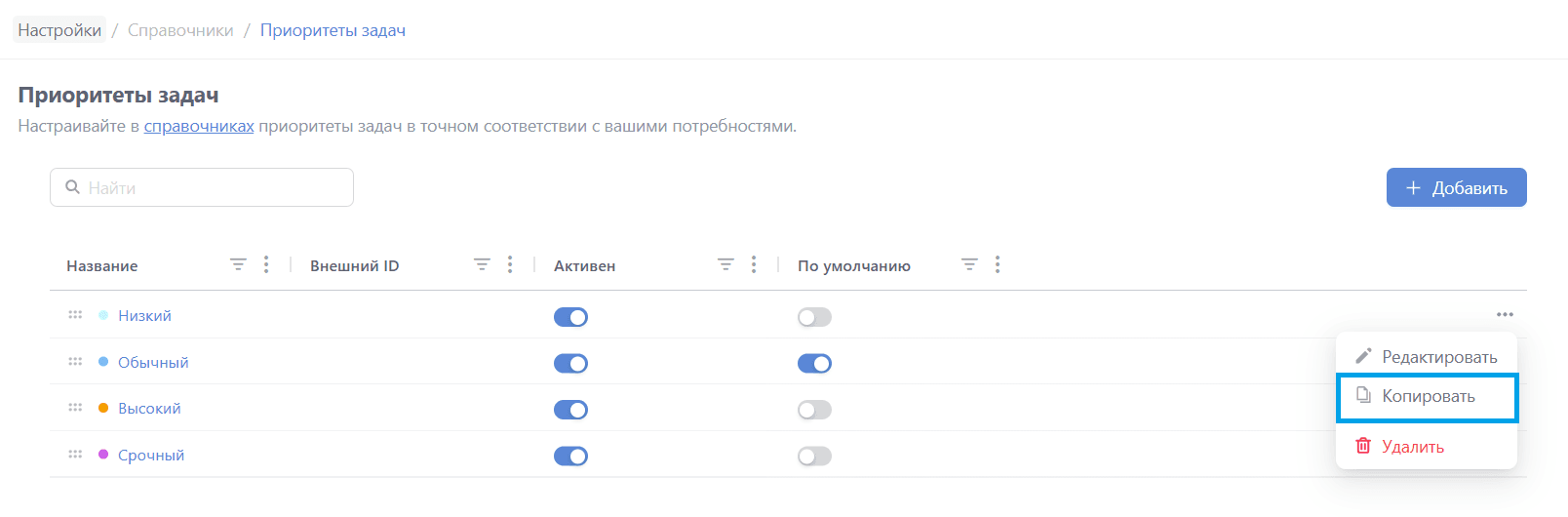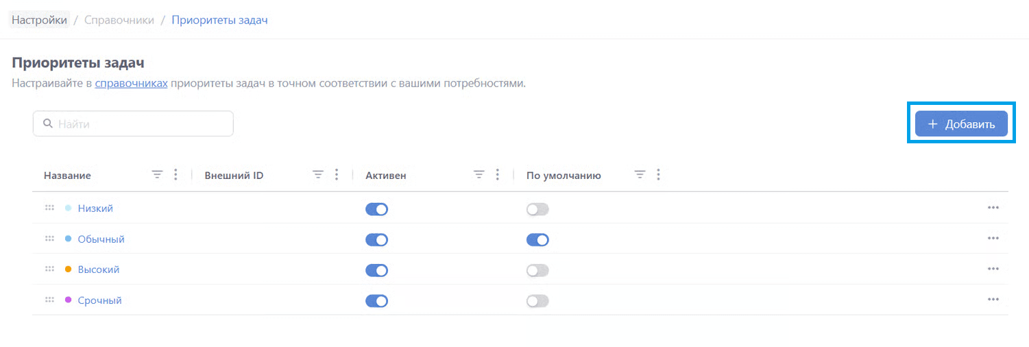 Для добавления приоритета нажмите кнопку "+ Добавить":