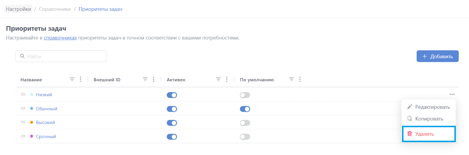 - переключатель "По умолчанию" - назначить приоритет выбираемый по умолчанию при создании задачи;