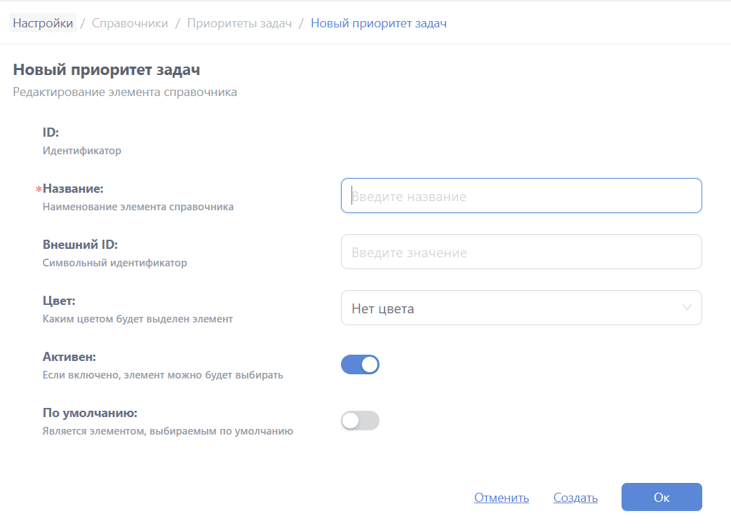 - Название - наименование нового приоритета (обязательное поле);