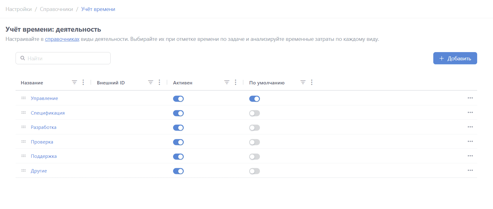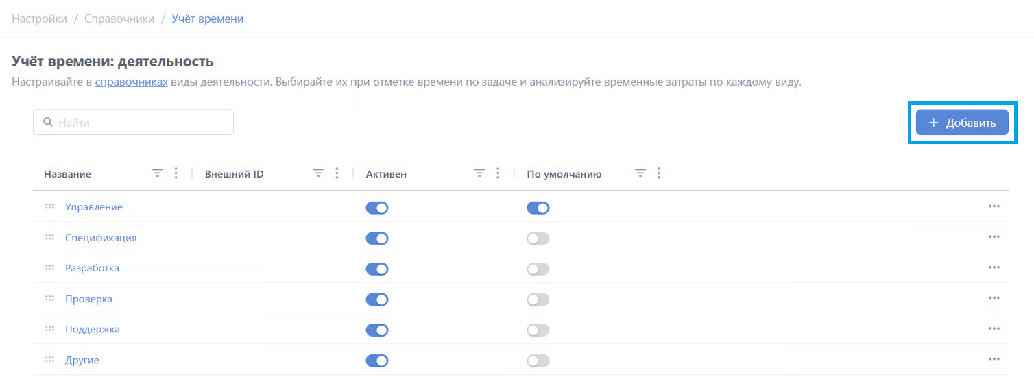 Для добавления вида деятельности нажмите кнопку "+ Добавить":