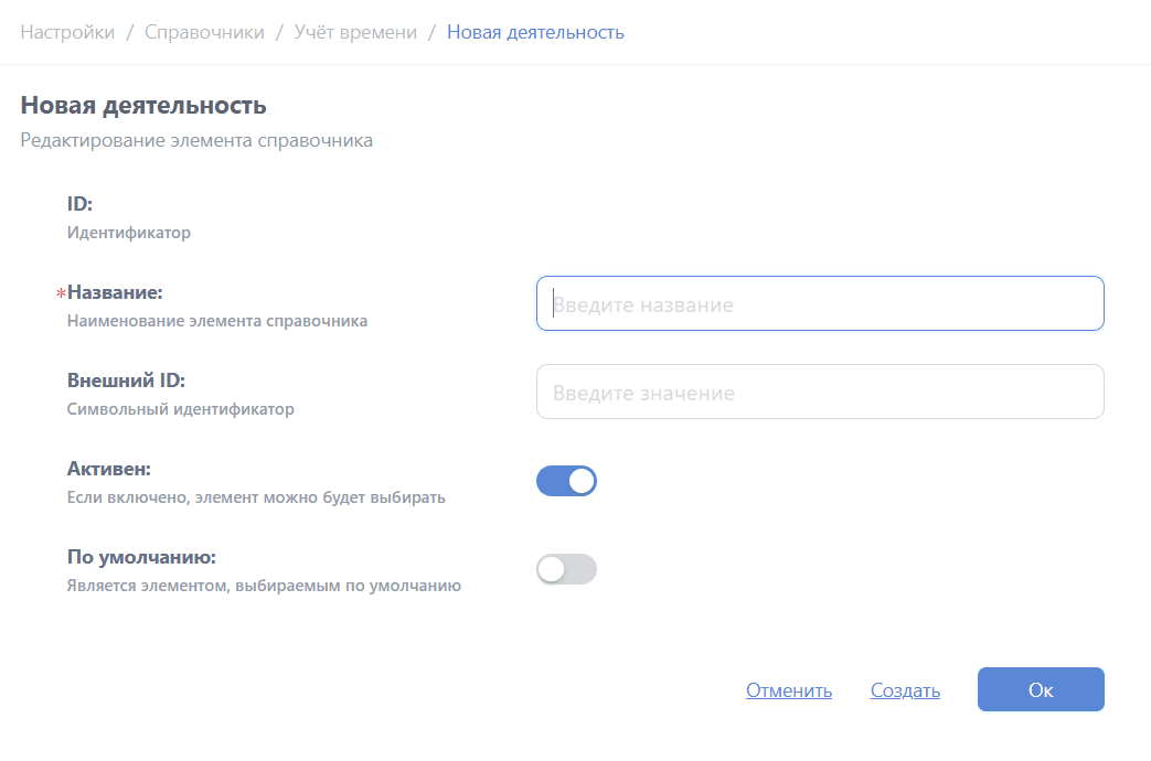 - Активен - отметьте, чтобы вид деятельности сразу стал доступен пользователям;