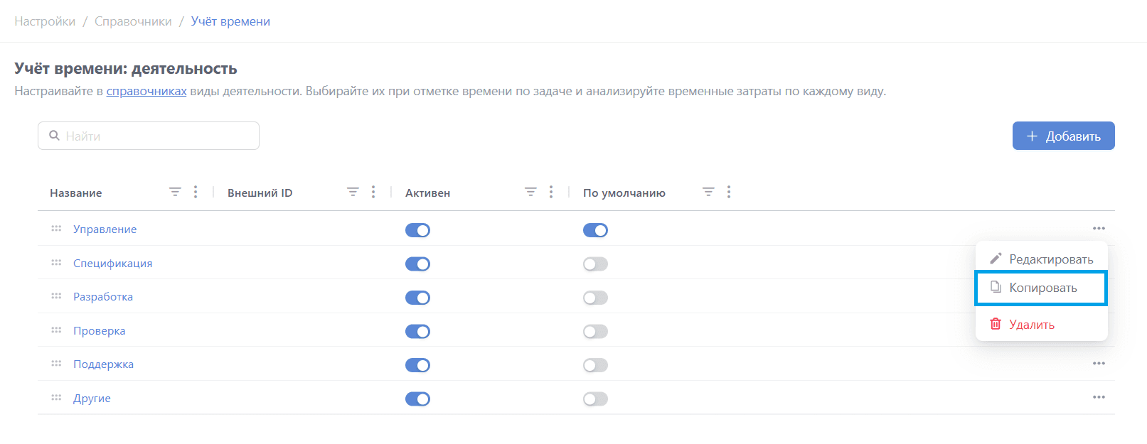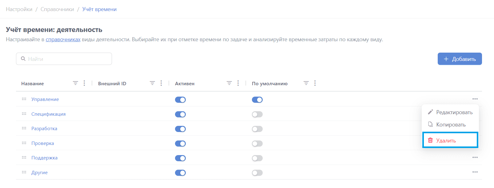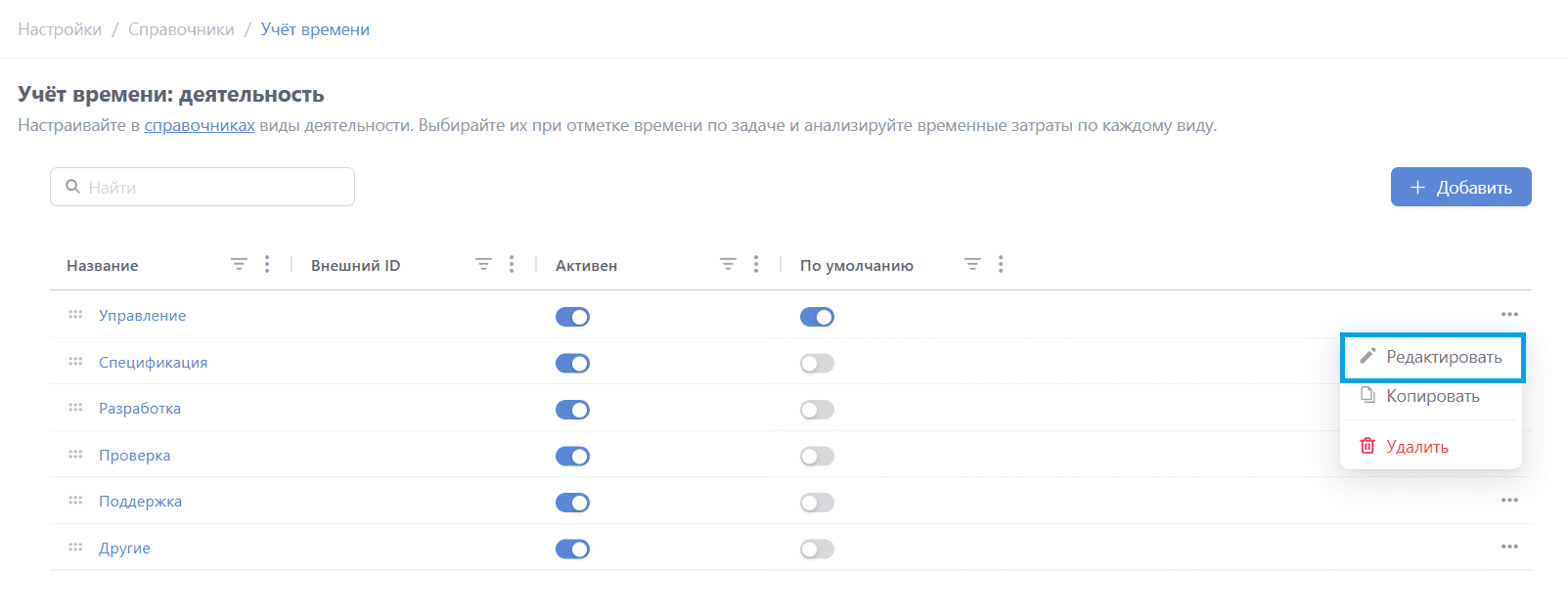 Доступные действия с видами деятельности в списке всех значений: