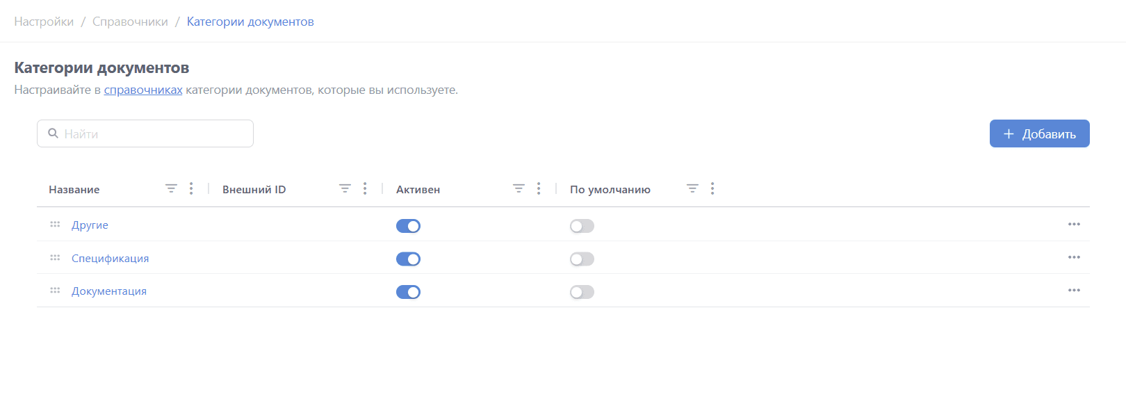 - Категории документов (для классификации в инструменте "Документы");