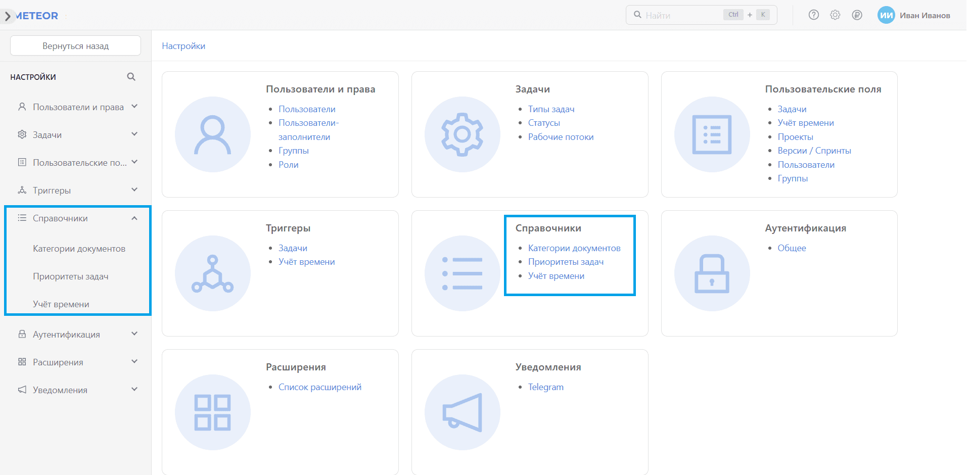 Раздел Справочники содержит предустановленные системные настройки: