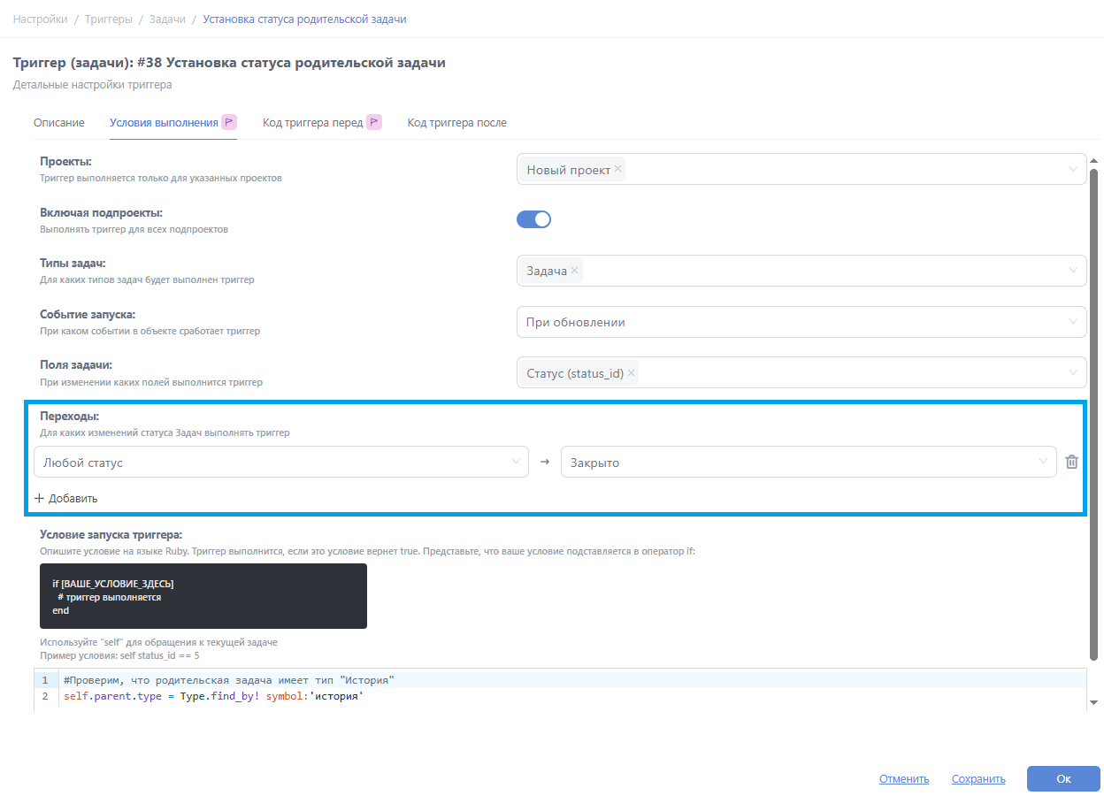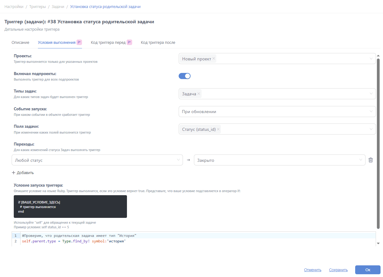 - Условие запуска триггера - программное условие запуска триггера, которое невозможно описать в полях настроек. На изображении показан пример, в котором проверяется тип родительской задачи: