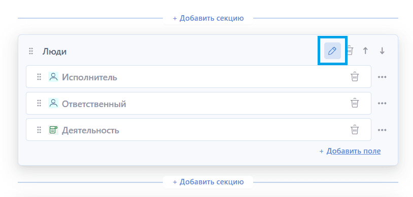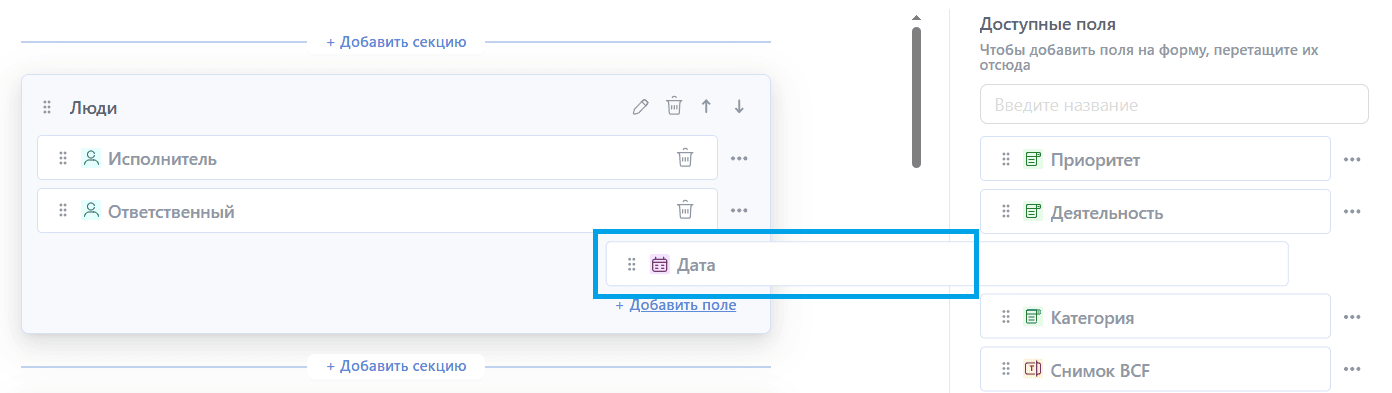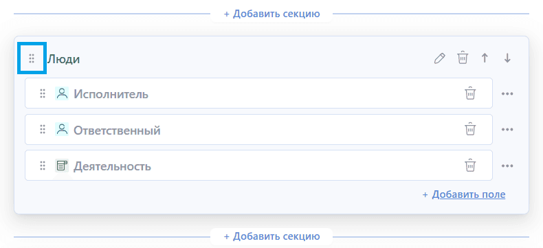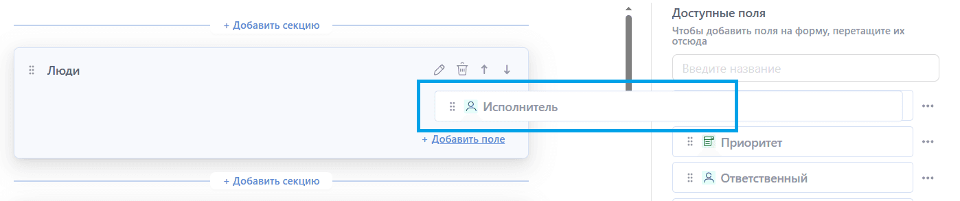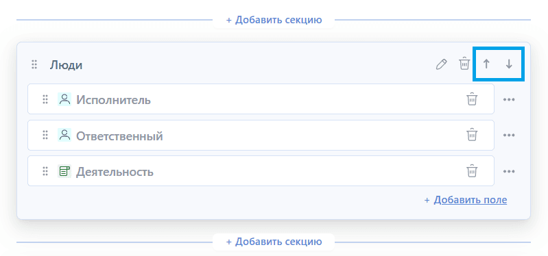 - Через контекстное меню поля (кнопки "В начало секции", "В конец секции", "Переместить в секцию"):