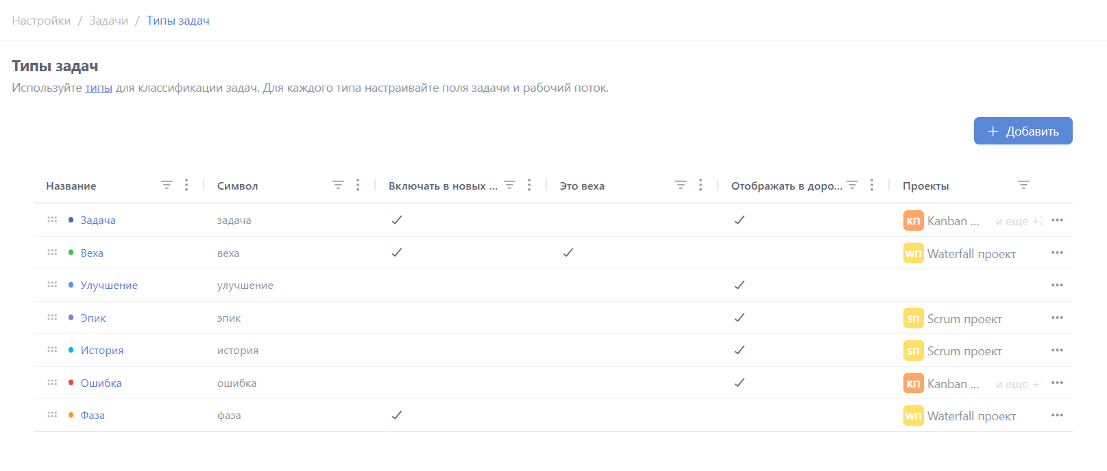 В открывшемся окне отобразится список всех доступных типов задач, основные настройки и проекты, в которых используется тип.