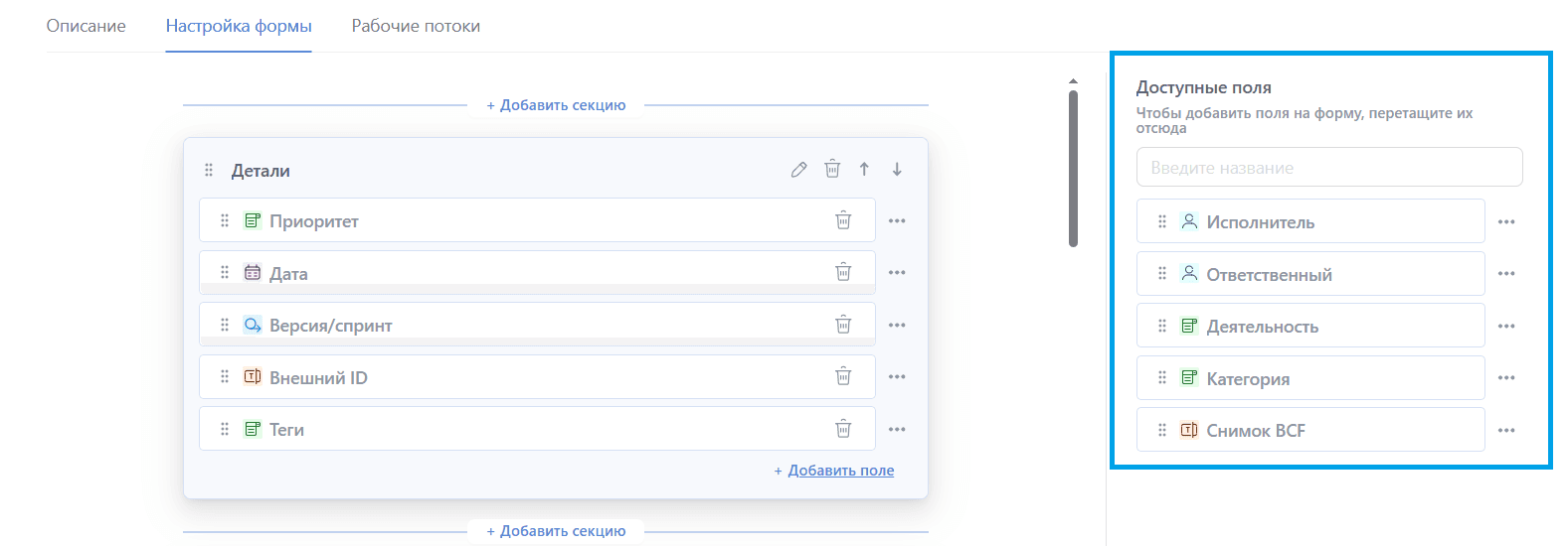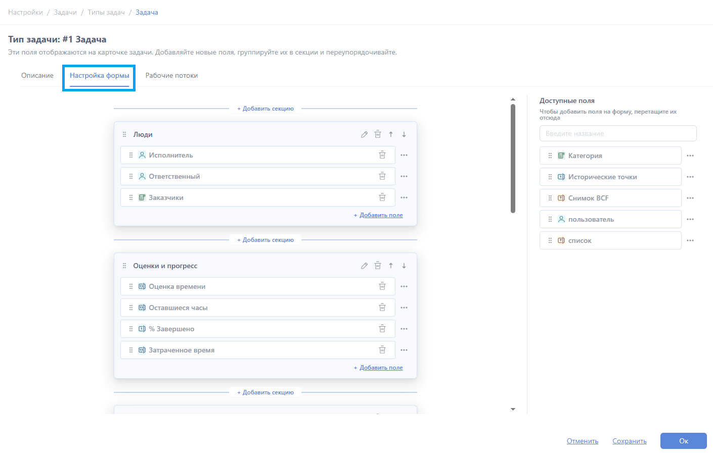 Настройте секции и поля для типа задачи во вкладке "Настройка формы". Добавляйте, удаляйте и настраивайте секции и поля — именно в том порядке, в котором они должны отображаться у ваших пользователей.