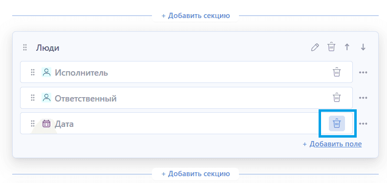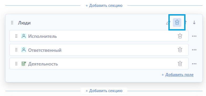 - Через контекстное меню поля (кнопка "Удалить из секции"):