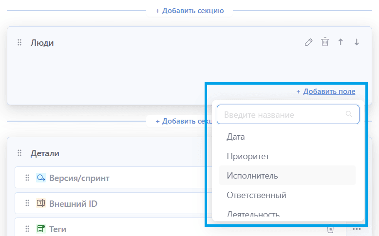 Чтобы добавить собственные поля для задач, перейдите в раздел "Пользовательские поля" в настройках системы. Там вы сможете создать поля различных типов (текст, число, список, дата, привязка к объектам и другие), которые помогут учесть уникальные требования ваших процессов.