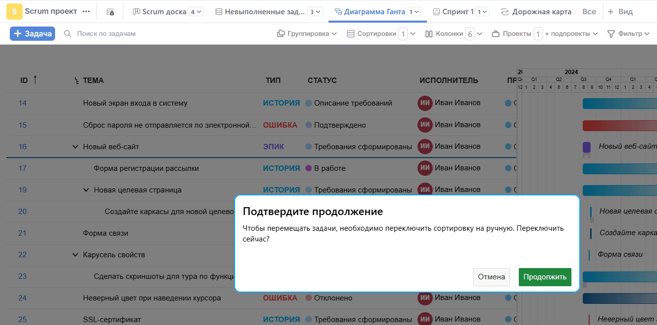 Для удобства отображения задач нажмите на кнопку Сортировки. По умолчанию сортировка автоматическая - по ID задачи. При перетаскивании задач система автоматически предупредит о необходимости сменить сортировку на ручную:
