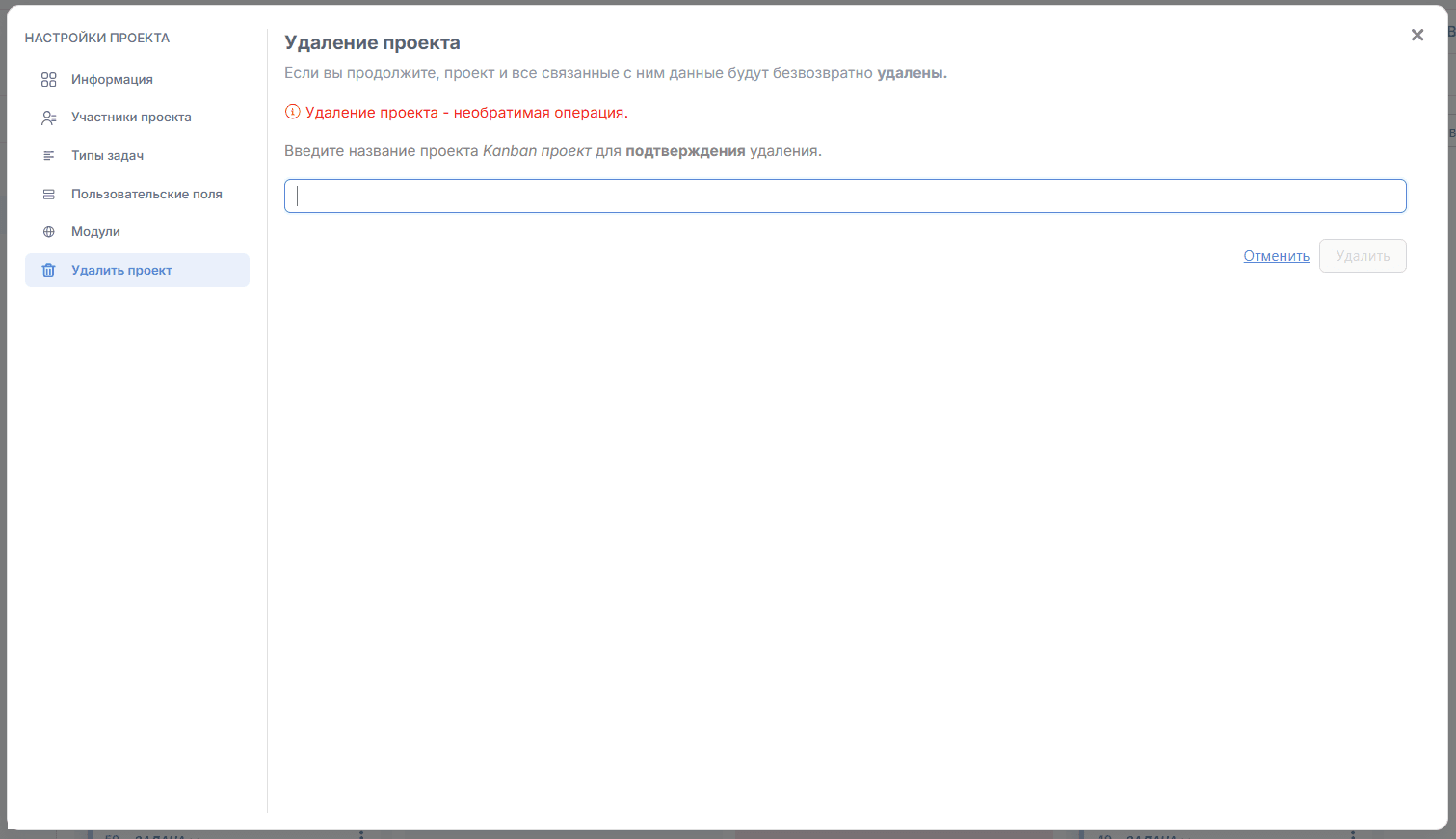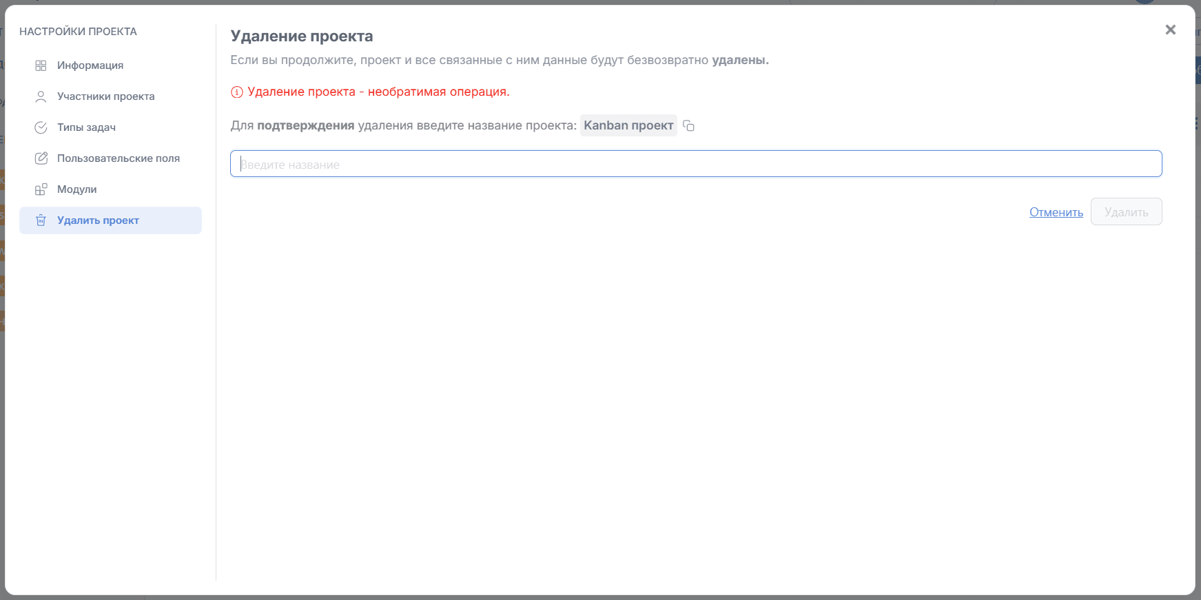 - Удалить проект - полное удаление проекта и всех связанных с ним данных. Требует подтверждения.