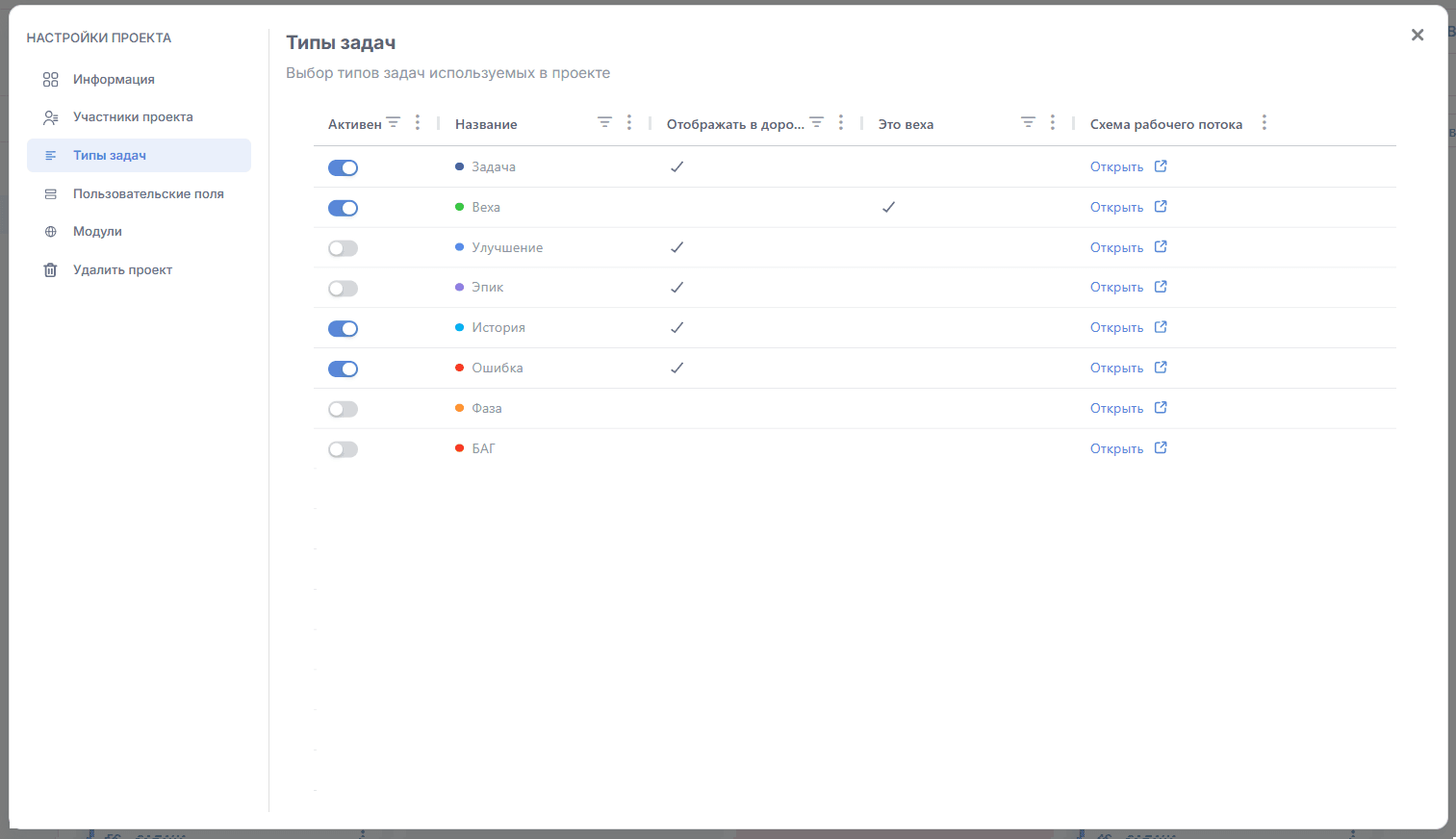 Во вкладке "Типы задач" - доступные в проекте типы задач. Отметьте те типы, которые хотите сделать активными.