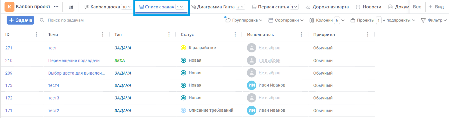 Пока вы не создали свои представления, или нет доступных публичных (доступных всем участникам проекта) представлений задач, то в проекте будет автоматически показан стандартный список всех задач - страница "Задачи проекта". Данная страница доступна в верхнем меню проекта и доступна всегда. Цель вкладки "Задачи проекта" - предоставить доступ к списку задач проекта для каждого участника.
