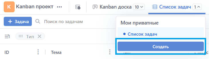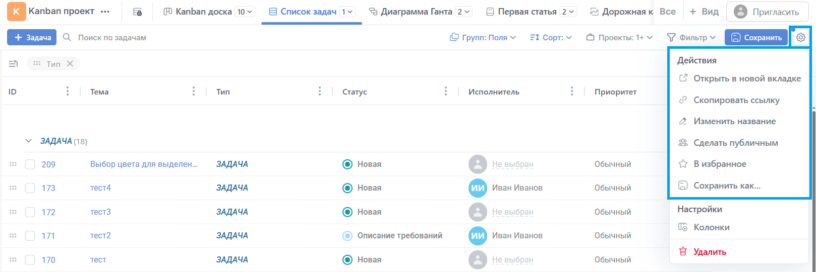 После создания хотя бы одного публичного представления задач (доски, списка или диаграммы Ганта) страница "Задачи проекта" отображается в виде иконки: