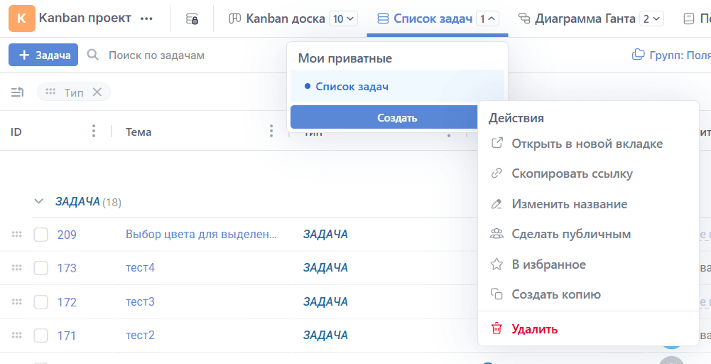 - Сделать публичной/приватной - изменить настройки видимости. При изменении публичности список переместится из раздела Мои приватные в Публичные или наоборот. Если один из разделов еще не был создан, он появится автоматически;