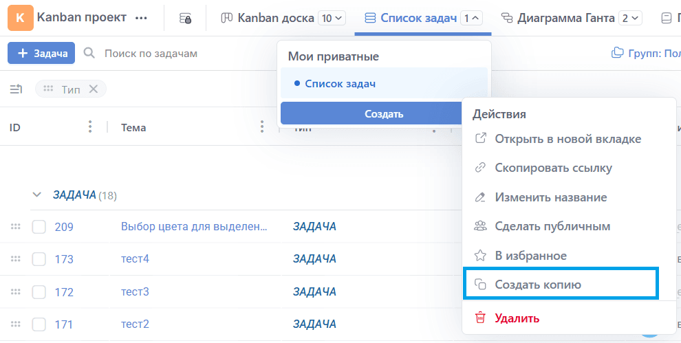 Выберите "Создать копию" в контекстном меню. Все настройки копируются, а новый список будет назван как исходный с добавлением слова "Копия" и появится в разделе Мои приватные. Название и приватность можно изменить.