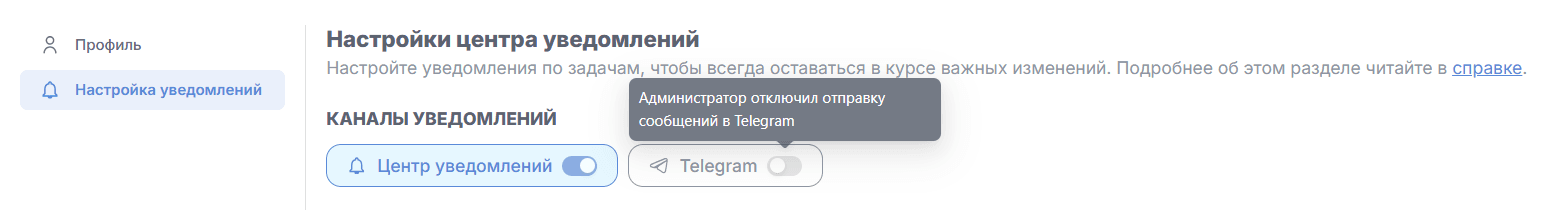 Если администратор экземпляра выполнил необходимые настройки, то при активации уведомлений в Telegram надо будет выполнить 2 шага.
