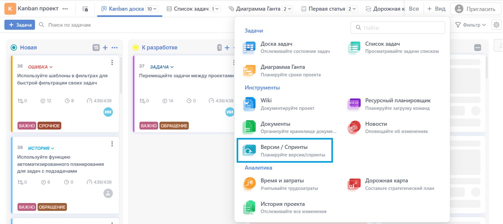 - на доске по версиям - здесь видны все существующие версии/спринты и задачи, которые к ним относятся. Чтобы узнать, как добавить колонки на доску, посетите страницу "Колонки на доске".