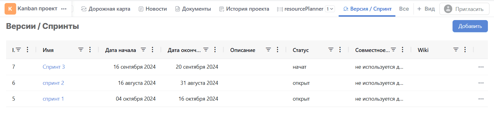 Для создания версии / спринта из раздела "Версии / спринты" нажмите кнопку "Добавить".