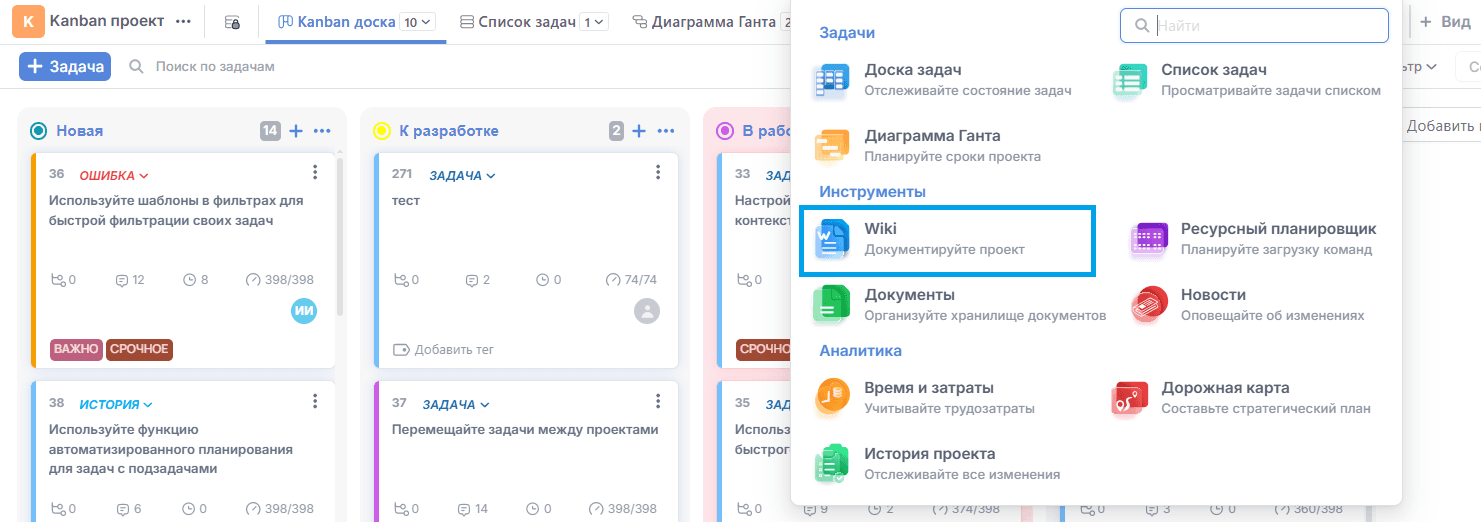 Для использования модуля Wiki, активируйте модуль "Wiki" в настройках проекта.