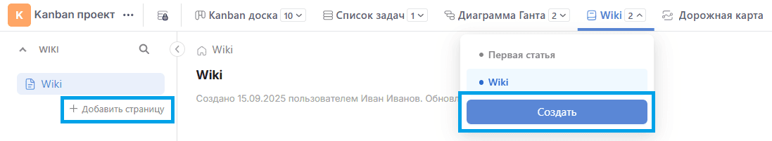 Новые страницы можно добавлять через кнопку "+ Добавить страницу" в левом меню или через кнопку "Создать" в списке всех Wiki-страниц.