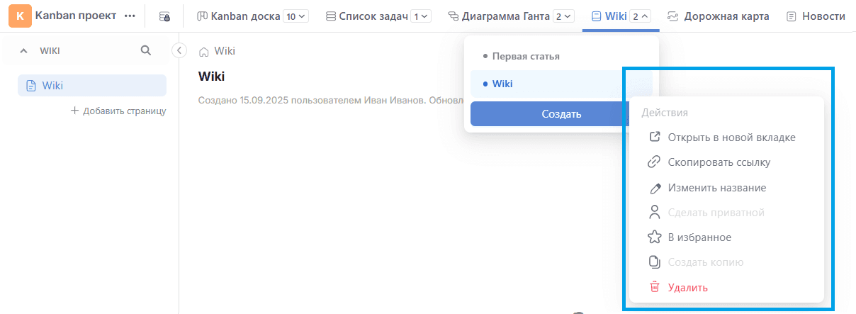 В контекстном меню страницы Wiki доступны следующие действия: