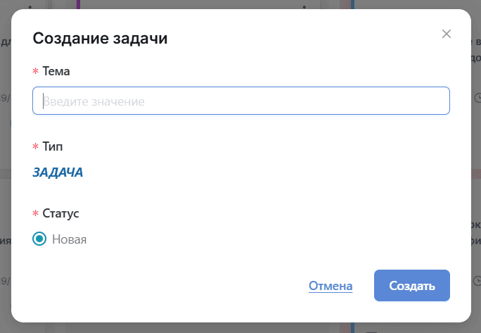 На доске можно создать задачу прямо в колонке. Для этого нажмите "Создать задачу" в колонке. В новом окне введите тему и выберите тип задачи, затем нажмите "Сохранить".