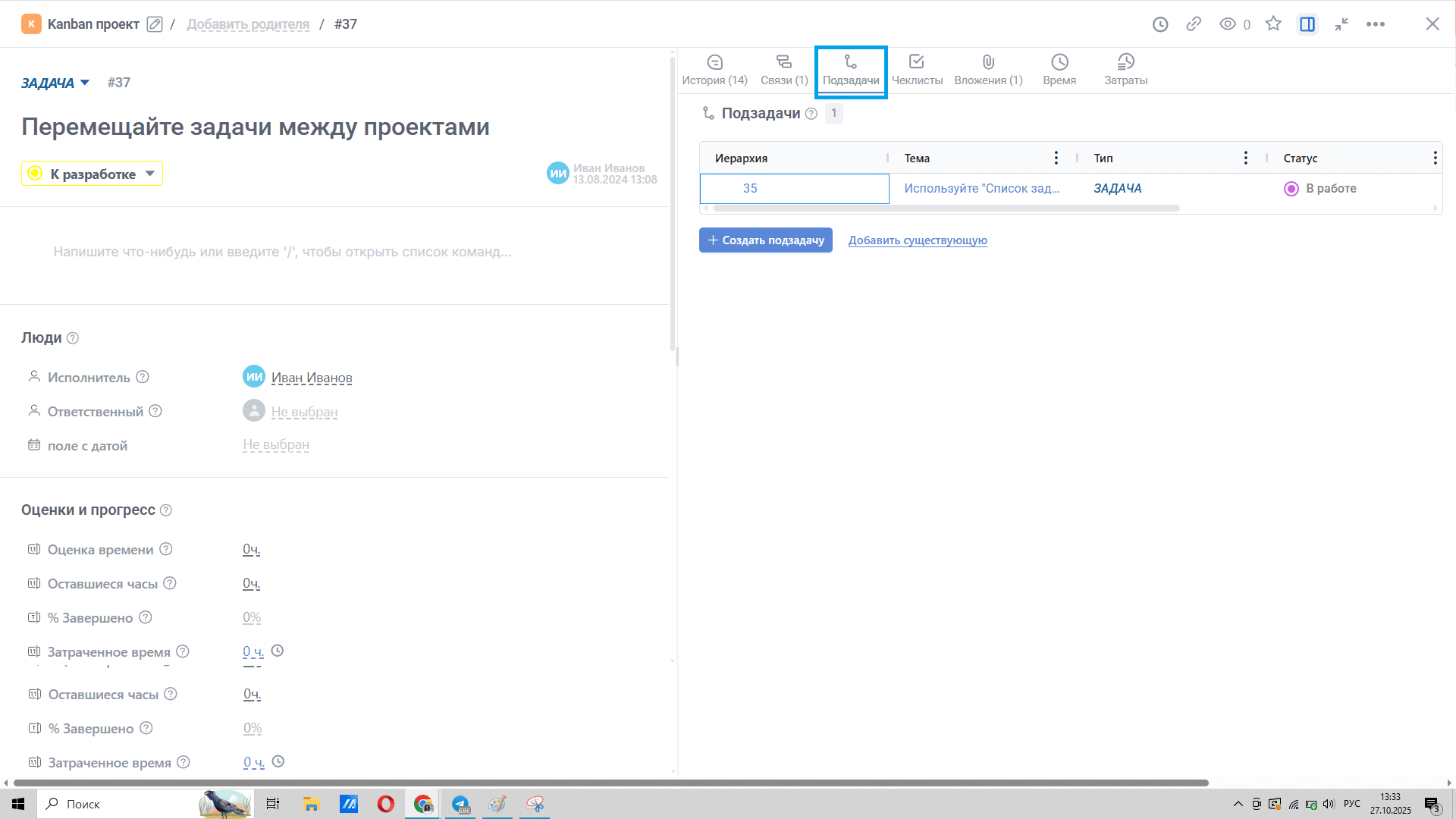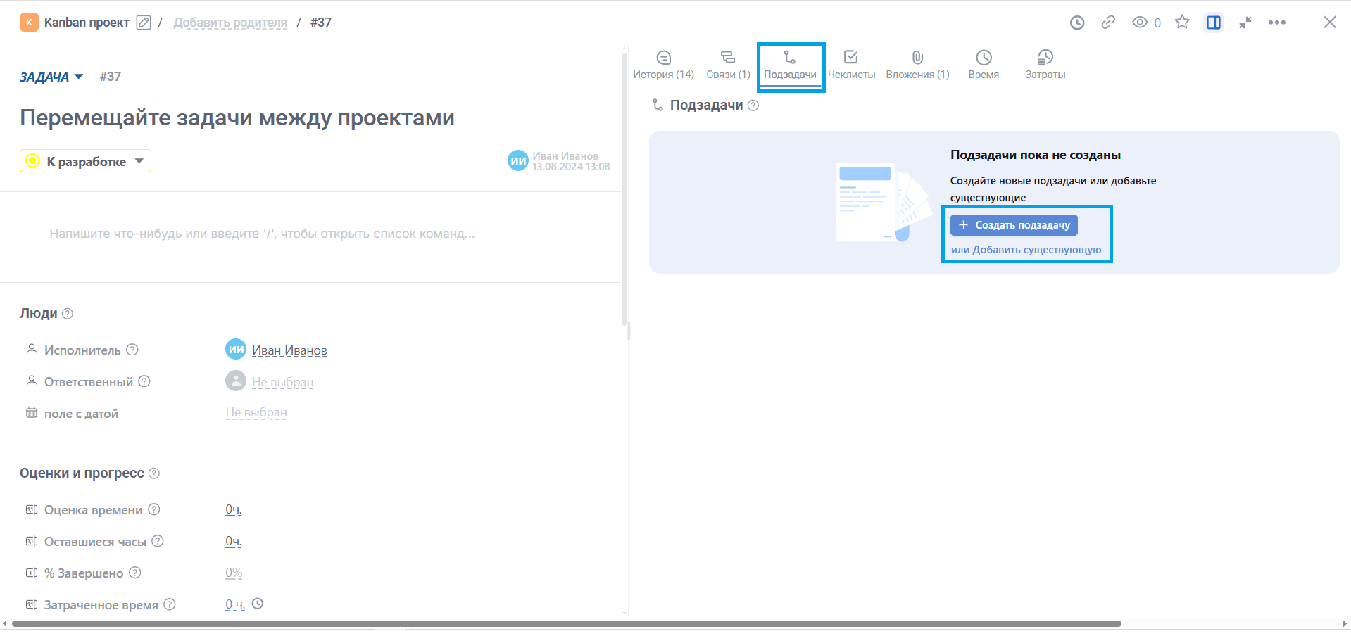В верхнем навигационного меню задачи перейдите в раздел Подзадачи и нажмите на кнопку "Добавить подзадачу".