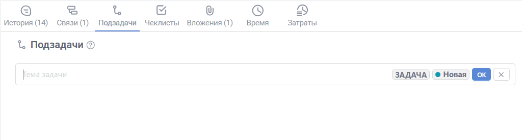 Нажмите "Создать новую подзадачу", чтобы создать подзадачу. Откроется окно быстрого создания подзадачи. Введите тему задачи, при необходимости измените тип задачи. Нажмите кнопку "Создать", чтобы создать задачу. Если настройками предусмотрено заполнение обязательных полей, то откроется отдельное окно для заполнения обязательных полей.