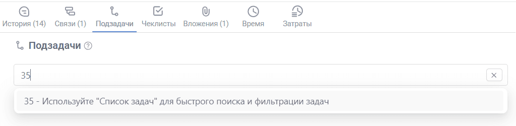 Нажмите "Добавить существующую задачу", чтобы сделать уже существующую задачу подзадачей. В появившейся строке начните вводить номер задачи или тему уже существующей задачи, выберите задачу из выпадающего списка и нажмите кнопку "Добавить подзадачу".